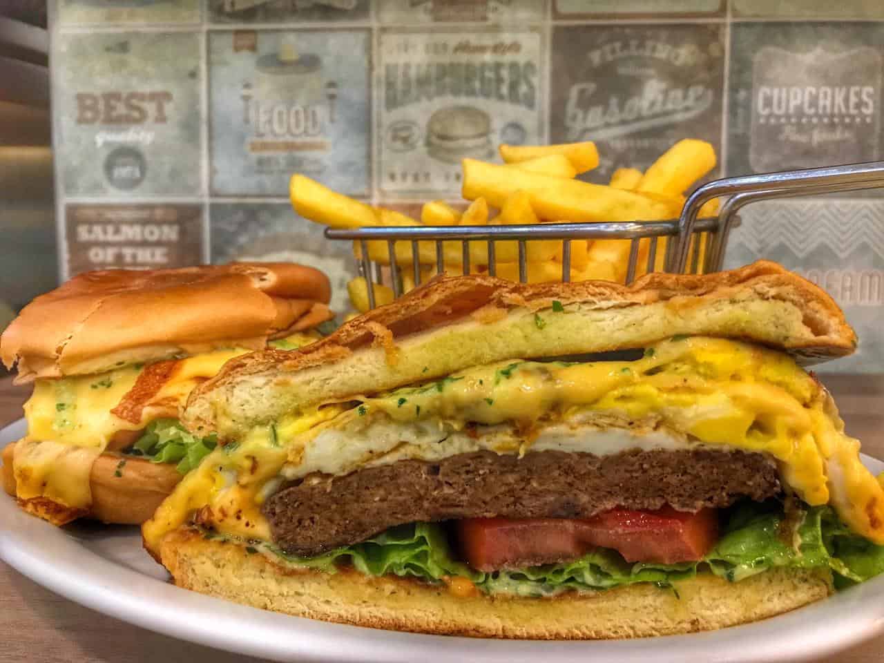 (saboroso hambúrger, queijo prato derretido, alface, tomate e ovo)